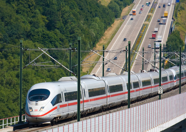 Europe, Germany, Rhineland-Palatinate, high-speed train ICE 3 on the high-speed line Frankfurt on the Main to Cologne parallel to the Autobahn A3 near Neustadt Wied, Hallerbachtal bridge. Europa, Deutschland, Rheinland-Pfalz, ICE3 auf der Hochgeschwindigkeitsstrecke Frankfurt am Main nach Koeln parallel zur Autobahn A3 bei Neustadt Wied, Hallerbachtalbruecke.
