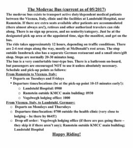 You can actually take a FREE ride on the Ramstein to Aviano Medical bus. Make arrangements with USO at Ramstein.   It departs Ramstein on Tuesdays and Fridays. It returns Mondays and Thursdays.