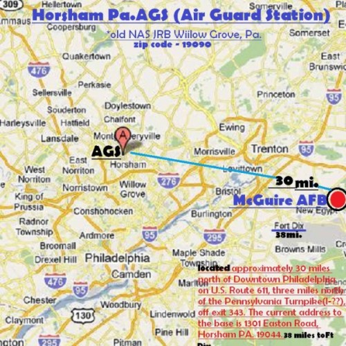 The old Naval Air Station Joint Reserve Base Wiilow Grove,now called Horsham Pa. AGS (Air Guard Station) is located approximately 30 miles north of Downtown Philadelphia on U.S. Route 611, three miles north of the Pennsylvania Turnpike(I-??), off exit 343. The current address to the base is 1301 Easton Road, Horsham PA. 19044.